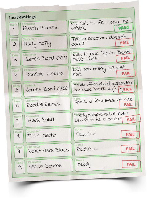 Ranked by Dr. Dorn we can see that despite Austin’s dodgy driving, he’s the safest of them all. Roger Moore comes out on top in the battle of the bonds. Frank Martin is fearless and just about in control, whilst the deadly Jason Bourne comes in last place as a real danger on the road.